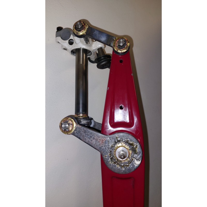 Oprava vidlice zahrnuje přestružení otvorů ve vidlici a hlavě řízení, výrobu nových vahadel nebo záchranu bočnic původních vahadel a vložení nových čepů. Nutno kontaktovat provozovatele stránky
